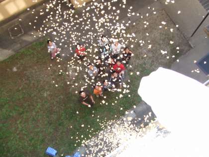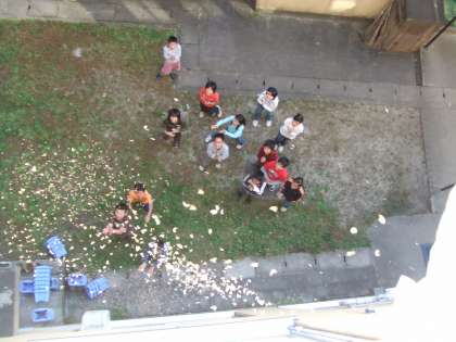 子どもたちが羽のような葉がついている種をたくさん集めて空からまきました。