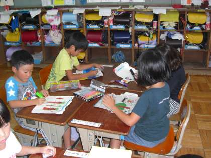 図工の時間,いろんな材質の紙に,夏休みの思い出を描きました。隣のお友達と話をしながら,自由に描きました。みんなとっても楽しそうでした。