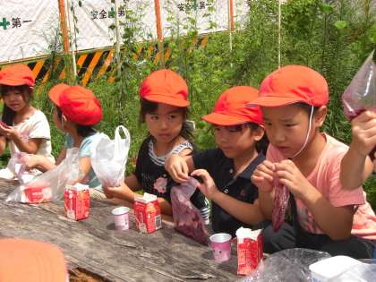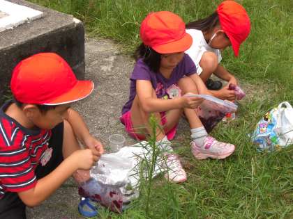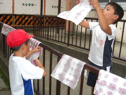 毎日,一生懸命育ててきた朝顔さん。たくさんのお花が咲きました。そのお花で,色水を作りました。とってもきれいな色水ができました。その色水を使って和紙を染めました。中庭に咲いている草を採って来て色水を作っている子もいました。