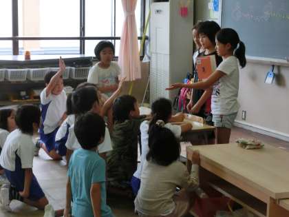 そして今日の昼休み,2年生の教室で「なぞなぞ」を出して遊んでいる姿がありました。笑顔の2年生を前に,5年生は何とも言えない優しい表情でした。