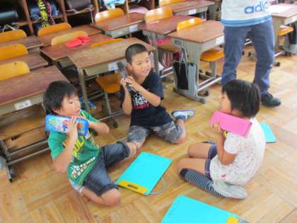 筆箱をおみこしがわりにしたり,太鼓をたたく真似をしたり。