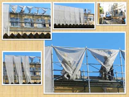 屋上まで組まれた足場。教室内の解体も二階部分に及んでいるのでしょうか。