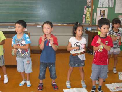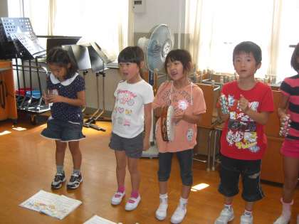 今の教室から音楽室までは遠い,遠い,遠いです。輪になって,リズム送りをした後,ポンポンポップコーンを楽器でリズム打ちをしました。みんな音楽が大好き!強弱を意識しながらリズム打ちができました。