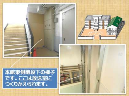 本館1階の東側の階段下ですが,ここはもともと北校舎へ抜ける入り口でした。改修後は放送室になります。今の放送室は本館の2階にあり,スタジオと併せると広い部屋でしたが,スタジオはほとんど使われず,荷物置き場のようになっていました。改修後は元の放送室が倉庫になり,スタジオが校長室になる予定です。