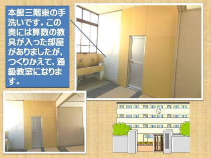 また,本館の3階東側奥の算数資料室は通級教室につくりかえられます。元の通級教室にはたんぽぽ学級が入り,通級は応接に移動しています。第1期工事で新しく通級教室ができあがると,もう移動する必要はありません。