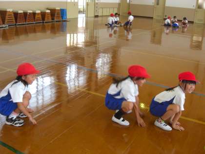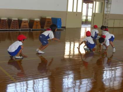体育の時間,表現あそびをしています。ちょうちょになったり虫になったりして遊びます。グループで,どんな虫になるかを話し合った後,虫の動きを考えました。1年生の子ども達は,直ぐに虫に変身できます。虫になって体育館をいっぱい飛びました。