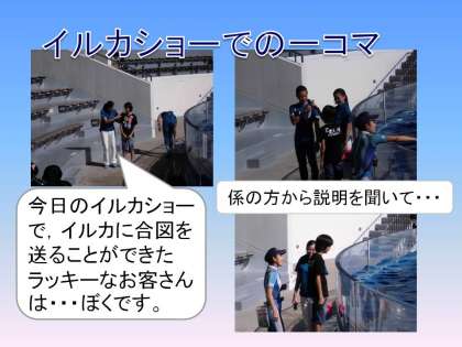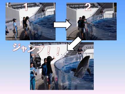 イルカに水をかけられ,びしょ濡れになりながら客席に戻ってきたのですが,「イルカがかわいかった〜!!」ととても嬉しそうでした。