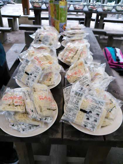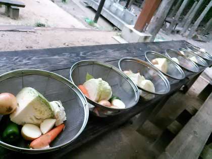 昼の野外炊事。材料の仕分けを、子供たちが炊事場につく前に、担当の学生ボランティアと教員がしています。