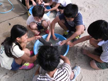たらいに水をため,ごしごしとつまみ洗いをして,汚れを落としていました。