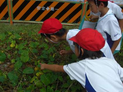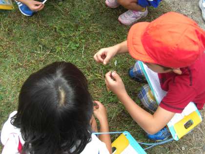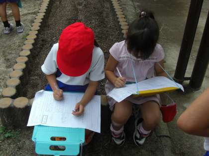 国語の学習で,小さな生き物を見つけ「みつけたよカード」を書きます。画用紙の表は“生き物の絵”裏は,“生き物を見つけた場所・様子・見つけ方”を書きます。今日は,公園や中庭に出かけ,生き物見つけをしました。見つけたら,ワークシートに項目別に書き込んでいきました。