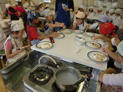 写真は,3年生の「ふれあい」でのようすです。トッポギを茹でて食べました。