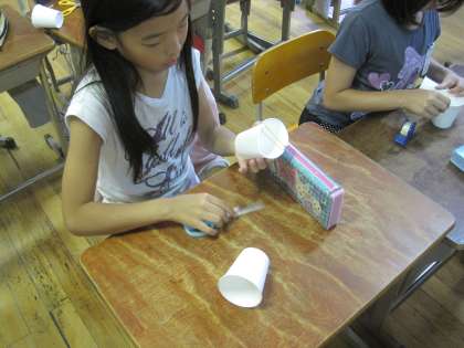 紙コップに切込みを入れて,ゴムを固定します。