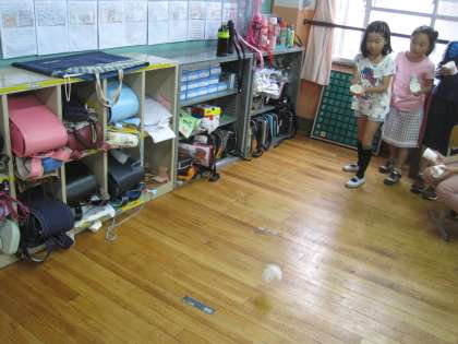 できあがったおもちゃを使って,どこまで飛ぶか点数を競う遊びをしている子たちもいました。