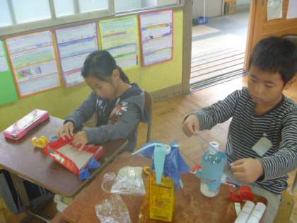 空き箱に輪ゴムをつけてギターのように音を出したり,ペットボトルの中にお米を入れて振って音を出したり・・・。