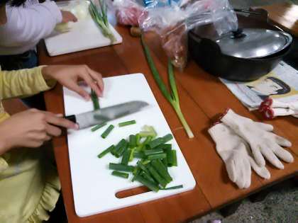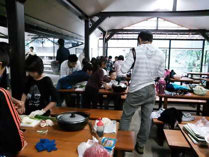 いよいよ野外炊事が始まりました。初めての竈。火をつけるのも大変です。さて、すき焼き風煮は美味しくできるでしょうか?