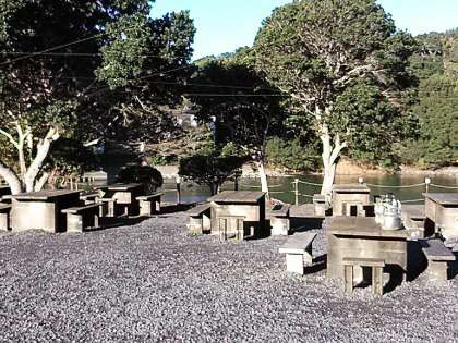 二日目の朝食は、昨日野外炊事をした、深谷水道のそばにある炊飯場の野外テーブルです。