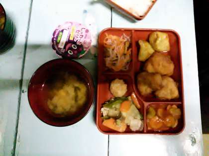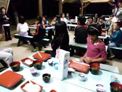 6時前の夕食です。子供たちの好きな唐揚げ,大学芋,ゼリー,などなど。決して食欲旺盛とはいえませんが,体調不良を訴えることなく,間もなくキャンプファイヤーの時を迎えます。