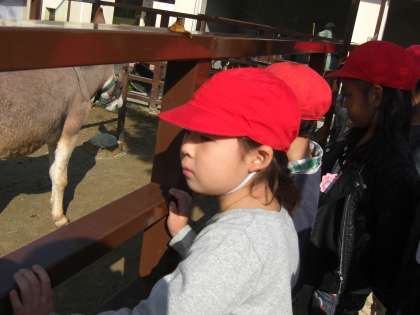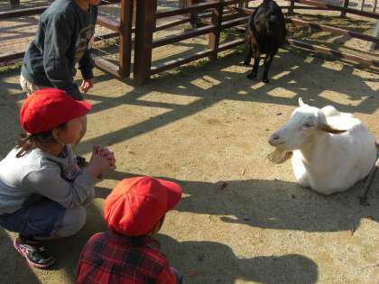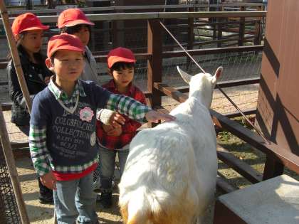 子ども達の顔がいつもより,にこにこ。お天気は快晴。にこにこグループに分かれて,学校を出発しました。まずは,おとぎの国で,やぎさんやひつじさんに触れあいました。おそるおそる手を出して触っている子どもたちでした。