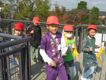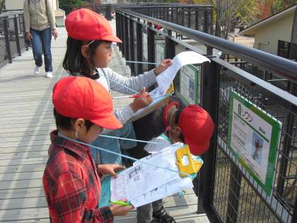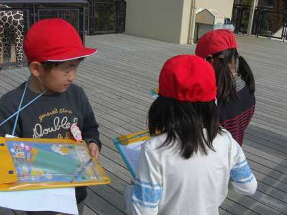 モルモットやウサギと触れ合った後,にこにこグループで,クイズラリーをしました。グループで力を合わせて,動物を観察して,問題を解いていきます。「キリンのシウンの誕生日は?」「マンドリルの赤ちゃんの名前は?」全部解くと,言葉が浮かびあがってきます。答えは分かったかな。