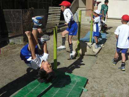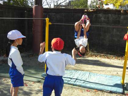 雨でのびのびになっていましたが,“鉄棒あそび”が終わりました。今日の活動の中心は,連続で何回,技ができるかです。お友達に数えてもらいながら,一回でも多くできるように頑張りました。次からは,パスゲームです。