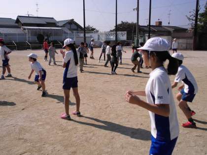 4年生から「2個のボールを使ってのドッジボール対決」を申し込まれたので,遊び係の人が練習のためにみんな遊びを企画してくれました。