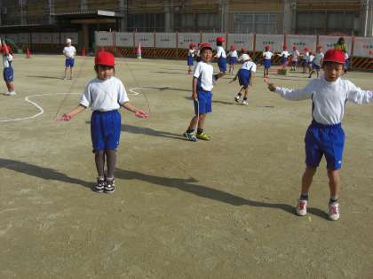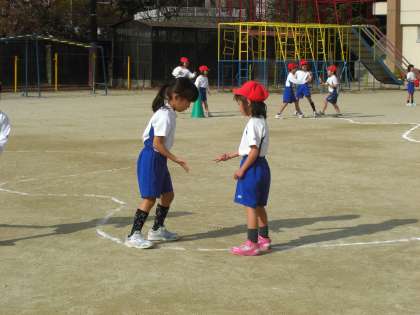 今日の体育は,陣とり遊びをしました。グループ対抗でしました。ぐねぐね道やカーブの道を走っていって,出会ったら「じゃんけん ぽん」負けたら次の人がスタートします。相手チームのコーンをタッチしたら得点です。どのチームも真剣そのものでした。