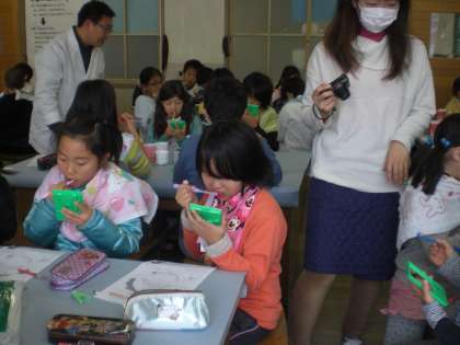 さぁ,赤くなった歯が白くなるまで磨きます。いつも磨いている力のこめ方で,歯は,白くなるのでしょうか。磨きながら子どもたちは,「まだ,白くならない。」「時間が,かかる。」と歯が綺麗になるまでには,時間がかかることを体験することができました。今日の学習を通して,毎日の歯磨きを振り返ってほしいと思います。