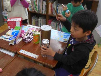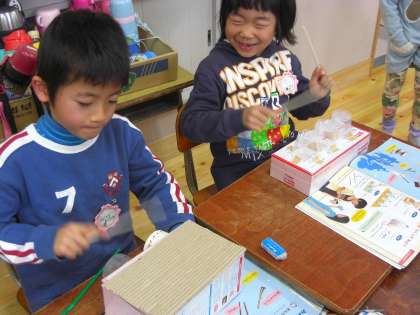 ペットボトルに水やどんぐりを入れたり箱にゴムをつけたりして,一人ひとり楽器を作りました。次の音楽の時間は,トライアングルや太鼓,自分の作った楽器を演奏しながら“音のマーチ”をグループで歌います。
