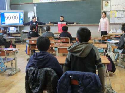 2組さんが中間休みに「ポーズを変えたのはだれだ!?ゲーム」を楽しんでいました。