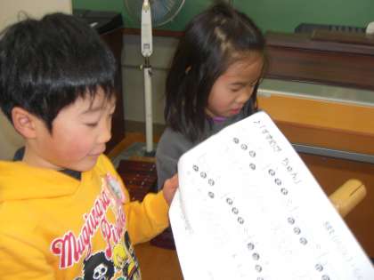 音楽の時間,「すずめがちゅん」の樂譜をもとに,かえ歌をペアでつくりました。きつねやイルカ,ライオン…いろいろないきもののかえ歌が出来上がりました。初めての作詞に子ども達は大満足。今度の時間は,決めた楽器で,演奏の仕方を考えます。どんな演奏になるか,楽しみです。