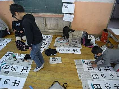 前回は,漢字ドリルでの練習でしたが,今回は,書写の時間に本当の書き初め大会を行いました。課題は,「日の出」です。床に画仙紙を広げて,一生懸命集中して取り組んでいました。