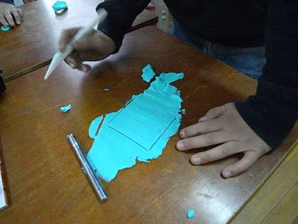 そこで,「つぶあん入り生八ッ橋『聖』」がどのようにしてつくられているのかを,粘土や絵を使って予想しました。