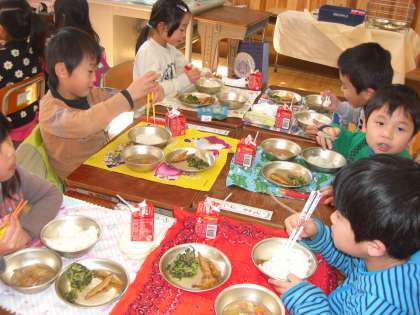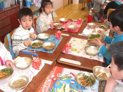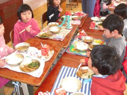 1年生 幼稚園のお友達と給食を食べたよ。