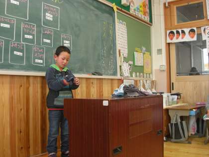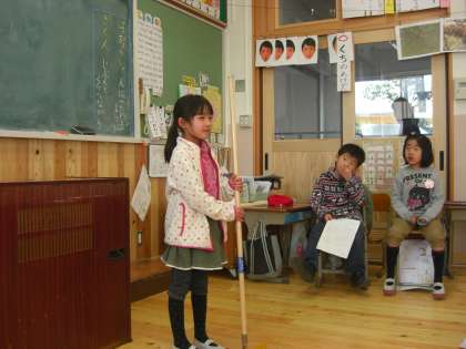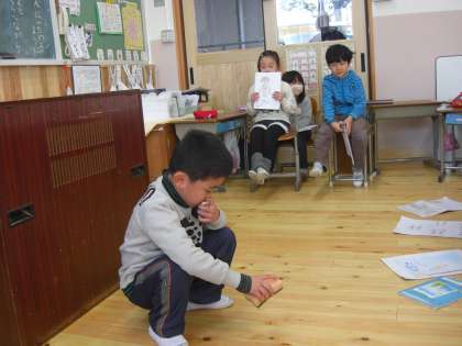1年生最後の参観日が,水曜日にありました。生活科で取り組んだ「にこにこ大作戦」を,一人ひとり発表しました。おふろそうじ,靴並べ,金魚のえさやり,せんたくたたみ,テーブルふき…発表のスタイルも自分で考えて,みんなの前で発表しました。