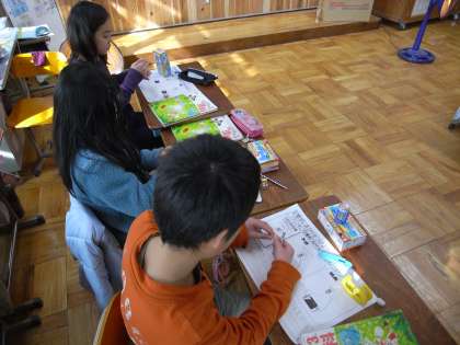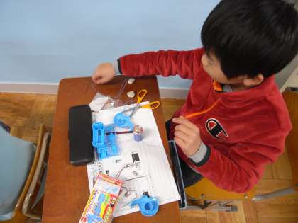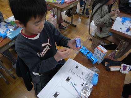 理科の時間では,豆電球のソケットを使わずに,豆電球の明かりをつける方法を考えました。「こうかな?ちがう・・・。」と,電池と導線,豆電球を手に持ち,じっくり考える姿が見られました。見事,自分の力で明かりを点けることができた子もいて,驚きでした♪