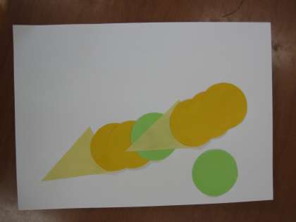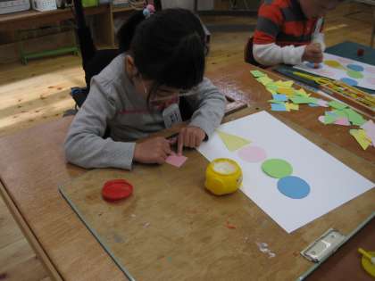 紙と紙をくっつけるのに必要な「のり」。「のり」の使い方を学習しました。両手がべたべたしないように,片方の手で,のりをすくい,もう片方の手で紙を押さえてのりを塗ります。のりを塗った紙を裏返して,下の紙に押さえて貼る。簡単な作業に見えますが,子どもたちは一つずつ手順を覚えながら,形を完成させました。出来上がった形は,何に見えますか?