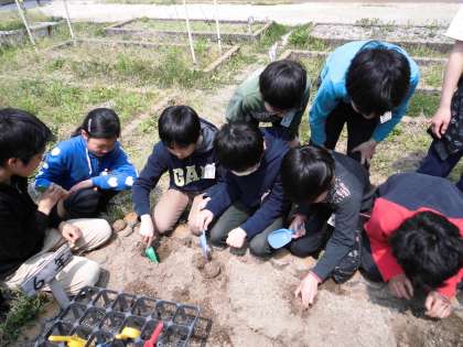 そこで,今日はクラスのみんなで種イモとホウセンカの種を植えました。