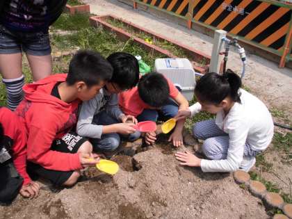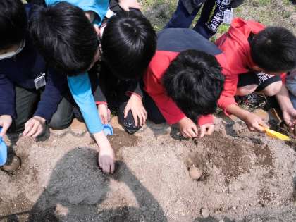 種イモからたくさん芽が出ていて,みんな面白そうに芽を触ったり観察したりしていました。グループの友達と役割分担して,てきぱきと植えることができました。