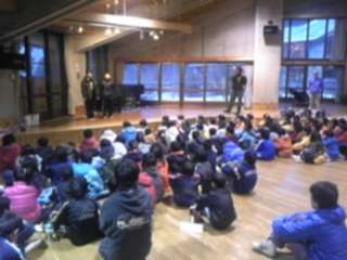 今朝は、山階小学校の4年生と朝のつどいを一緒にしました。お互いの学校紹介や簡単なゲームを山の家のスタッフの方にしていただきました。外は、うっすら雪景色です。これから朝食です。子供達は、元気です。