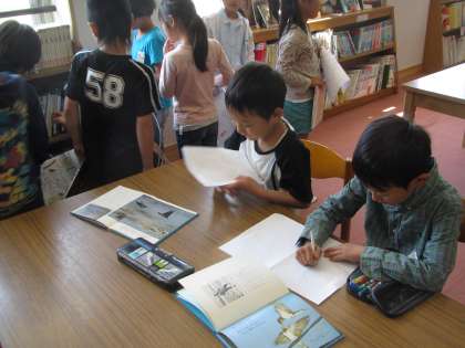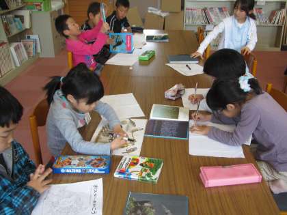 愛鳥週間のポスターを描くために,図書館で鳥の本を見て調べました。