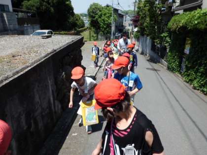 生活科の時間に町探検に出かけました。お天気にも恵まれ,みんなわくわくしながら学校を出発しました。まずは哲学の道を歩いて法然院に向かいます。哲学の道では、きれいな花や疏水で泳ぐ鴨を発見しました。法然院では池の大きな鯉に大興奮!!不思議な木も見つけました。