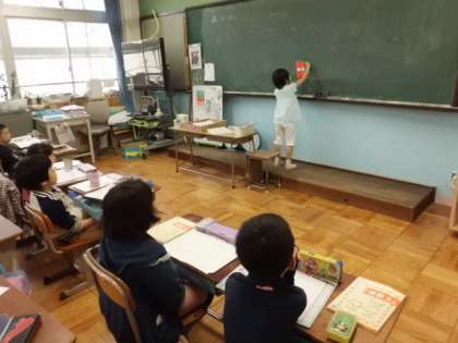 今度は二人組で考えを説明します。そして最後にみんなの前で,大きな数え棒を使って計算の仕方を説明します。