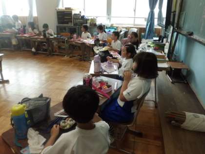 午前中の競技を終え,暑さにバテ気味の子どもたちでしたが,お弁当を見た途端にニコニコ笑顔に!!おうちの方からのメッセージがついていたり,全校ダンスの「妖怪ウォッチ」のキャラクターのおにぎりが入っていたり…わいわい楽しみながら,輪になっていただきました。