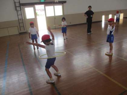二人組になってころころ転がしたり,腰の周りで回したり・・・