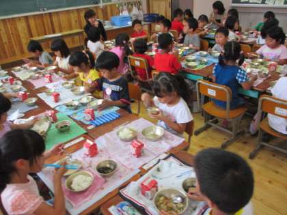 たんぽぽ学級の1年生と一緒に給食を食べました。