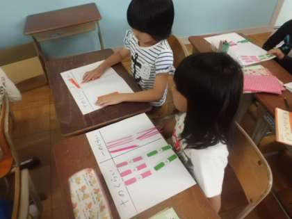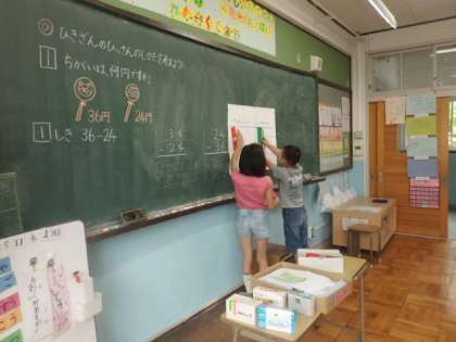 今日は引き算の筆算の学習をしました。足し算の学習をした経験を生かして,筆算の仕方を自分たちで考えて説明することができました。はじめは発表することを躊躇していた子も多かったのですが,「前で考え方を説明したり,筆算を解いたりしたい人!」と言うとたくさんの手が挙がるようになりました。残念ながら全員当てることはできないので,「明日当ててあげるから…。」と言って納得してもらったほどでした。