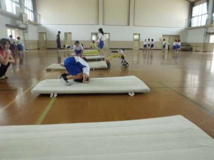マット運動も4時間目になり,だんだん上手に回れるようになってきました。いろいろな場の使い方もばっちりです。最初はきれいに後転ができる人は2,3人だったのですが,もうクラスの半分近くができるようになっています。練習の成果ですね。