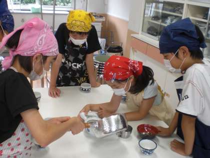 家庭科の学習で,お茶を沸かす実習を行いました。お湯を入れて煎茶,ほうじ茶,緑茶,玄米茶,色々な種類のお茶を飲みました。お茶の葉の量や,お湯を入れて蒸らしている時間の長さで,お茶の濃さが変わることを知りました。計量カップや計量スプーンを使って,お茶の葉の量やお湯の量をはかることも経験しました。お湯のみに入ったお茶の色を見て,「薄いかも。」「これ,絶対濃いわ。」と,味を想像しながら楽しんで,お茶をいれていました。