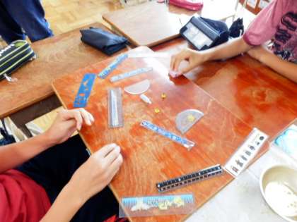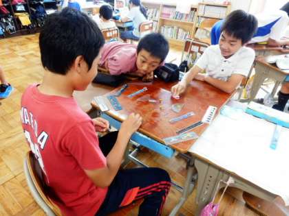 文房具を使って,迷路のようなものをつくり,相手の陣地にボールのようなものを入れる遊びです。