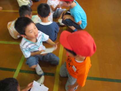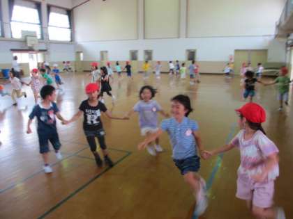 にこにこグループのお兄さん,お姉さんと手をつないで,一緒に追いかけたり逃げたりしました。